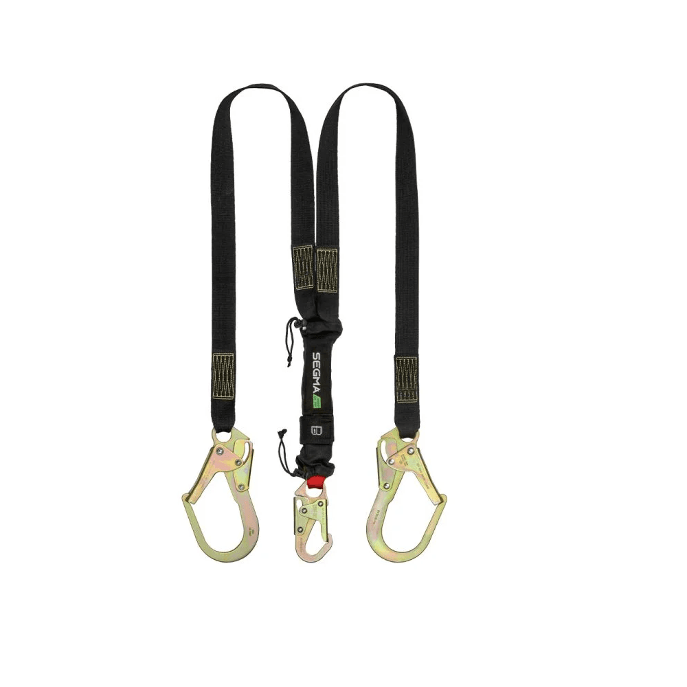 - Cuenta con dos ganchos escala de acero doble gatillo, que permiten anclarse de manera segura, además del mosquetón simple.