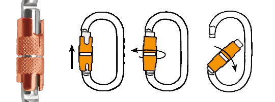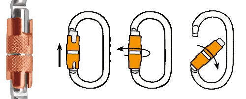 El sistema Tri-Lock dispone de bloqueo automático y desbloqueo rápido. Para abrir el mosquetón se necesitan tres movimientos independientes como se muestra en la imagen siguiente.