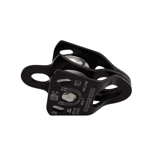 - Las placas laterales mecanizadas permiten un diseño más compacto manteniendo la misma capacidad de cuerda que otras poleas.