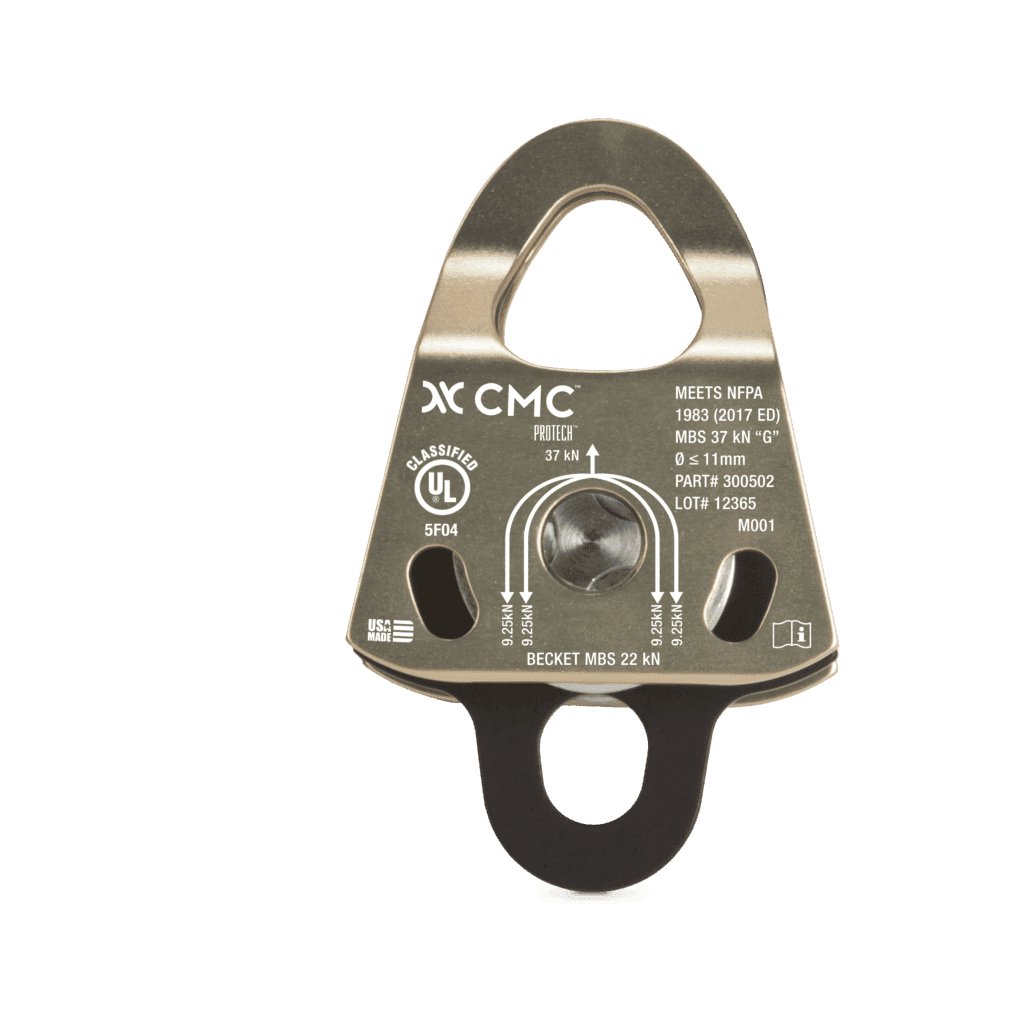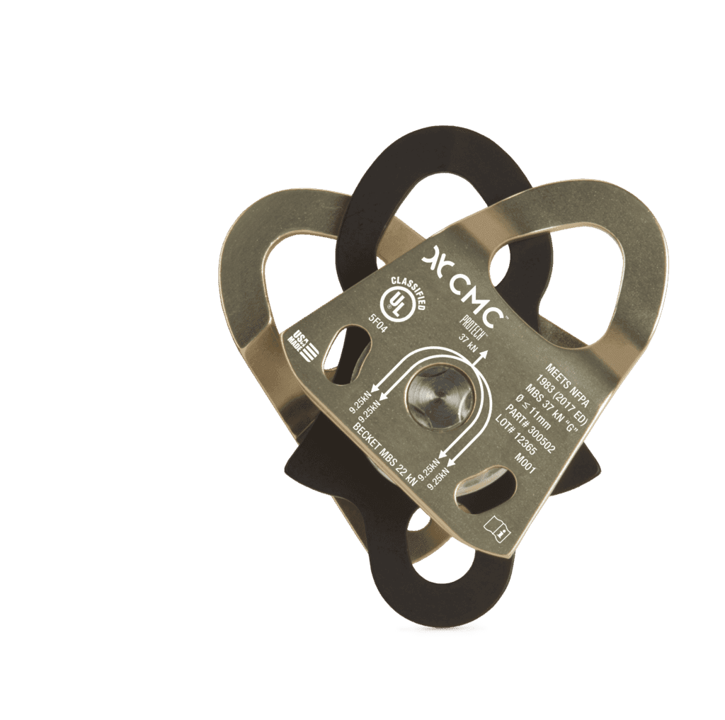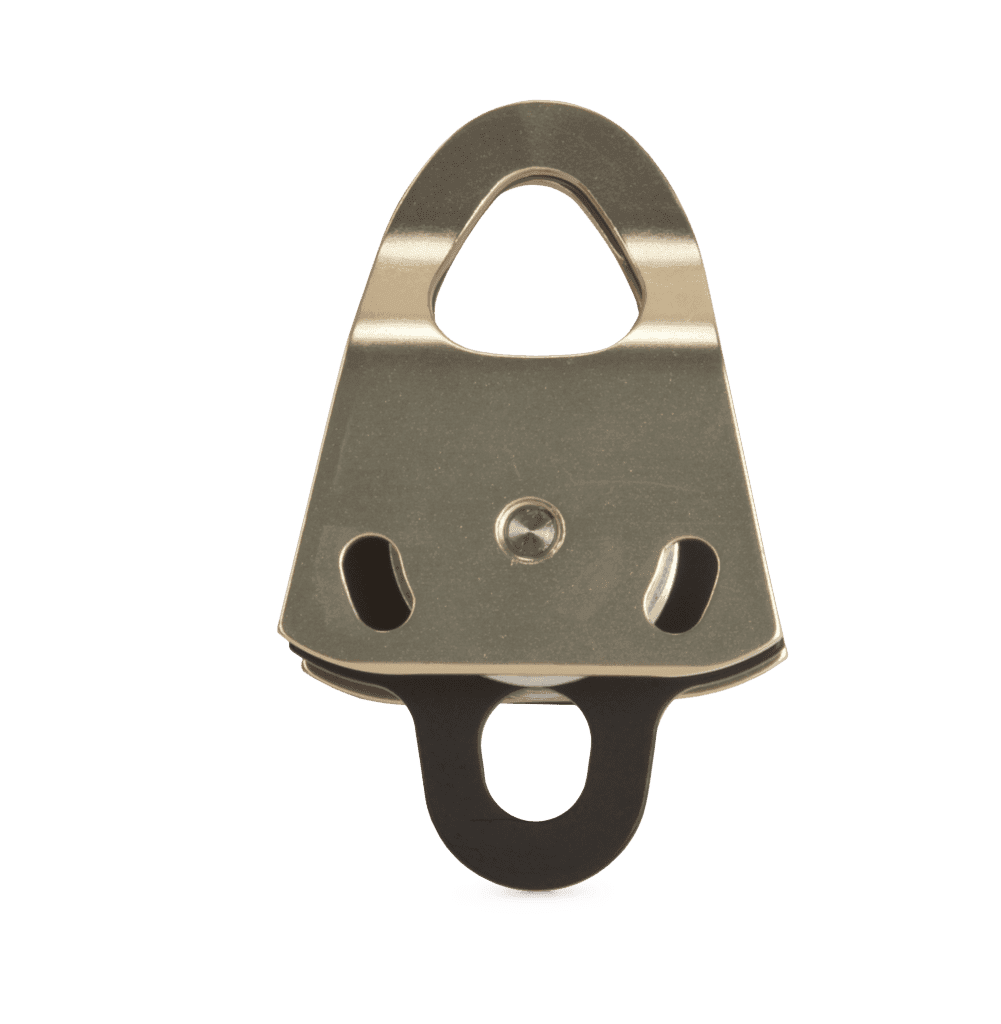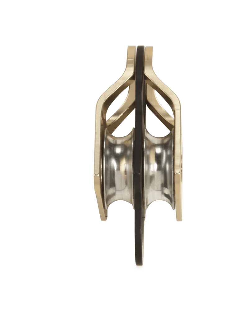 Polea doble de placas laterales oscilantes. Sirve para cualquiera que necesite algo ligero y de bastante resistencia como para el rescate en montaña, trabajos verticales, etc. El conjunto de eje unico lateral, permite una placa lateral lisa y que no se topa con la superficie. Se utiliza con cuerdas de 13mm como máximo.