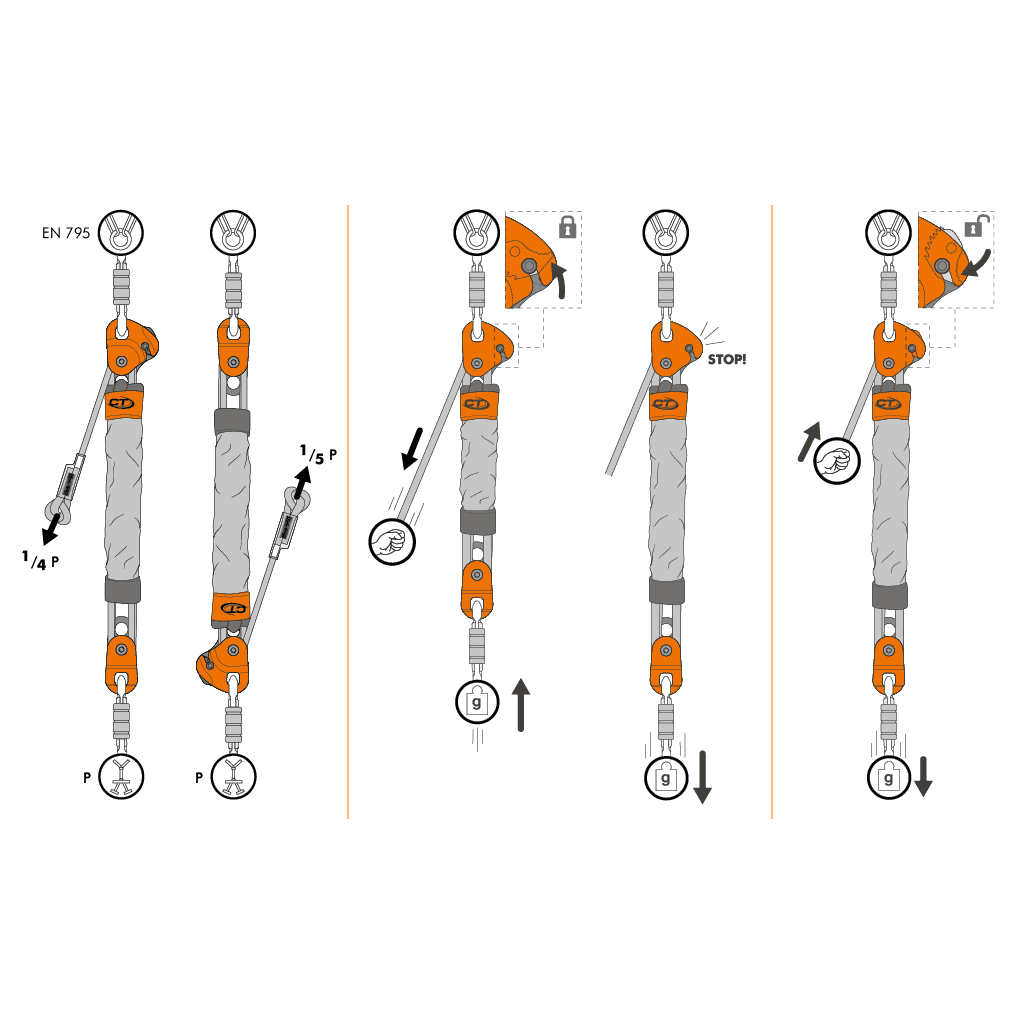Polipasto de izado autobloqueante, con factor de desmultiplicación de 4 o 5 si se le da la vuelta, ideal para el uso en maniobras de rescate. Desarrollado para permitir el izado y desbloqueo del trabajador accidentado o para poner en tensión un sistema.
