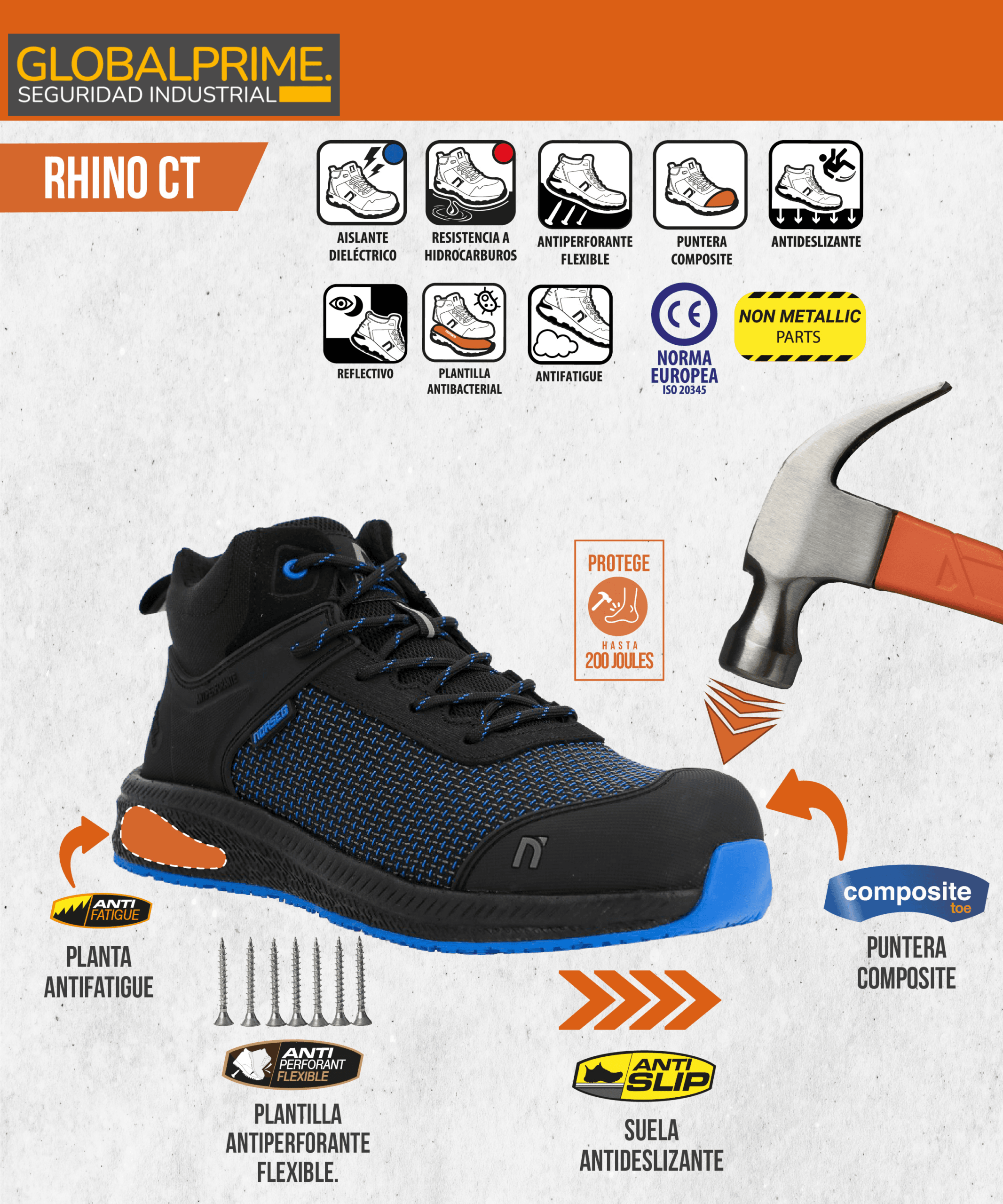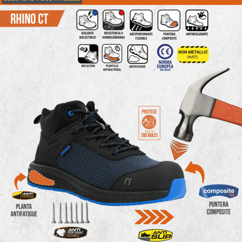 • La zapatilla de seguridad RHINO CT está diseñada para trabajos industriales y operativos en entornos secos, combinando puntera composite, plantilla antiperforante flexible tipo Kevlar y diseño 100% no metálico.